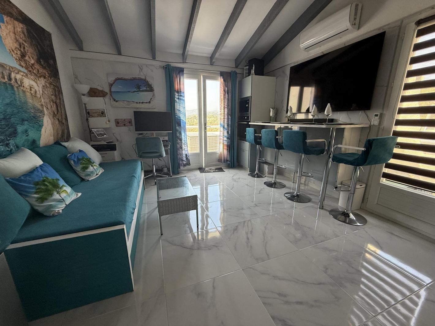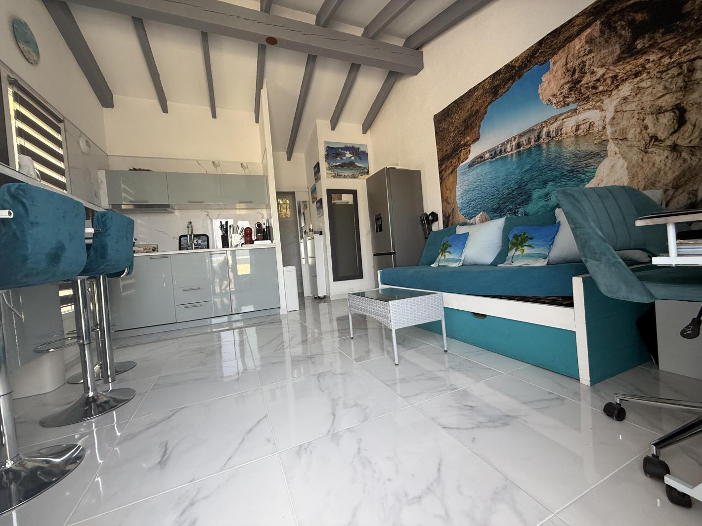 1 chambre avec un lit double, salle de bains avec douche à l'italienne, WC Séparé, séjour ouvrant sur la grande terrasse en partie ombragée, Le séjour dispose d'un canapé avec lit gigogne pour 2 personnes, Télévision, la partie cuisine aménagée et bien équipée, Climatisation. Wi-Fi.