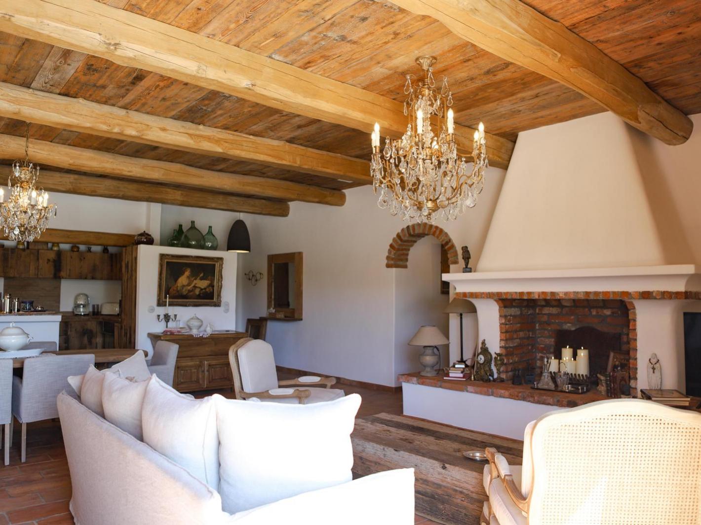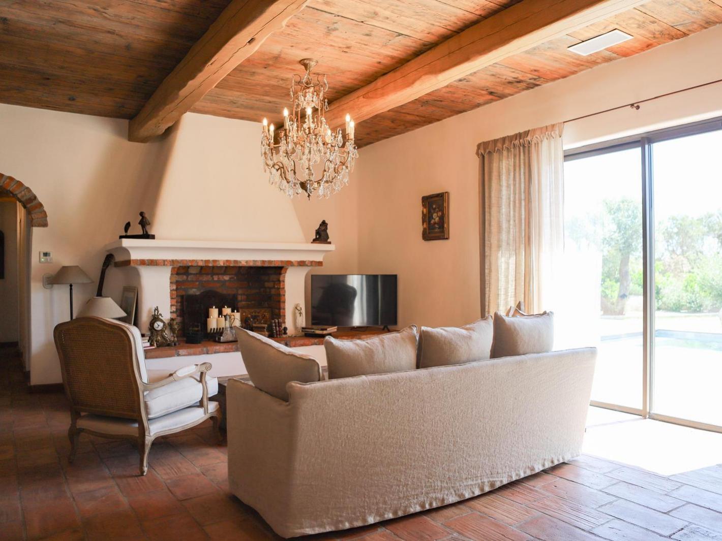 Le séjour salon avec TV, qui ouvre sur une immense terrasse avec une belle piscine, le salon de d'extérieur et les transats.