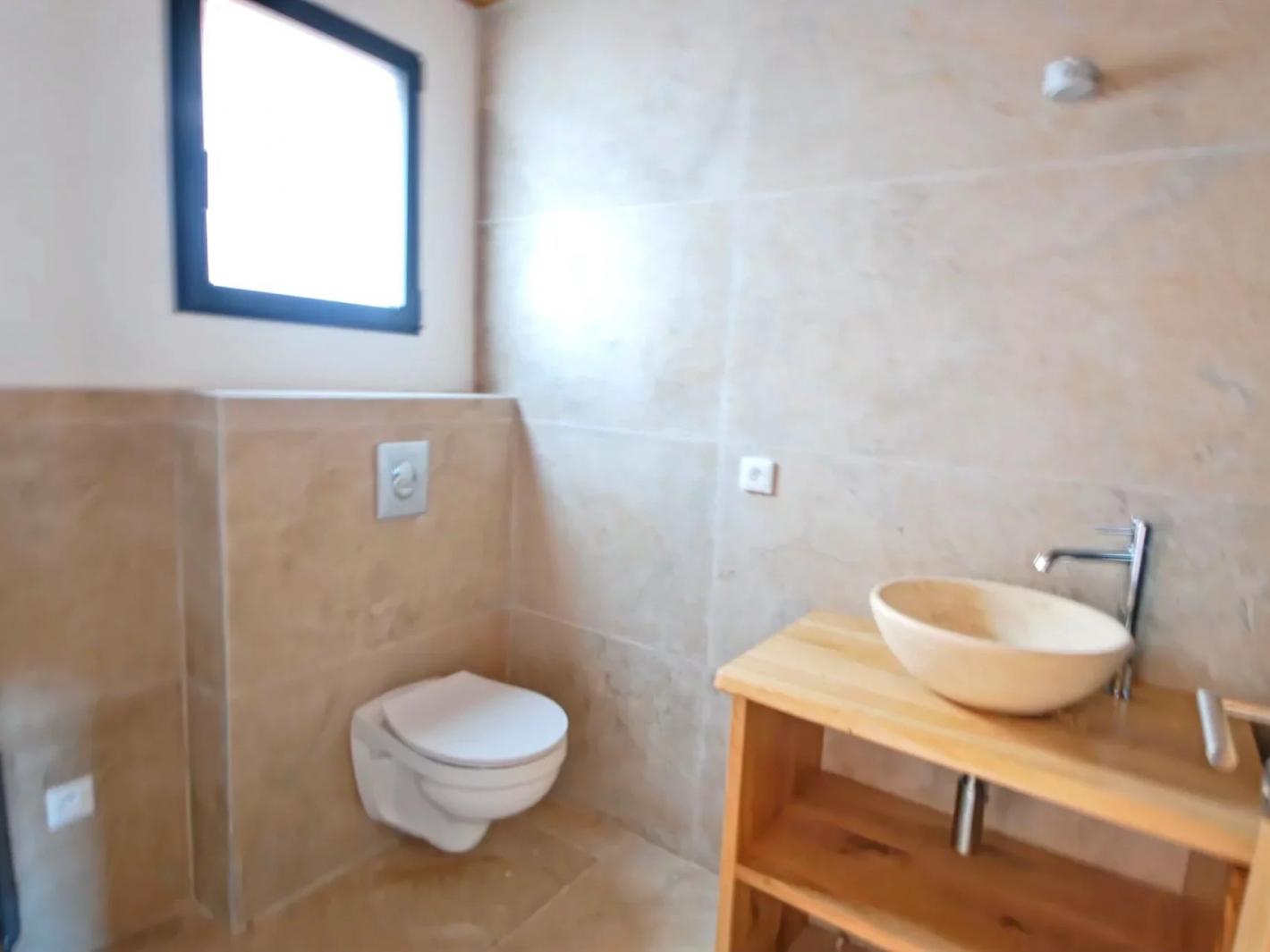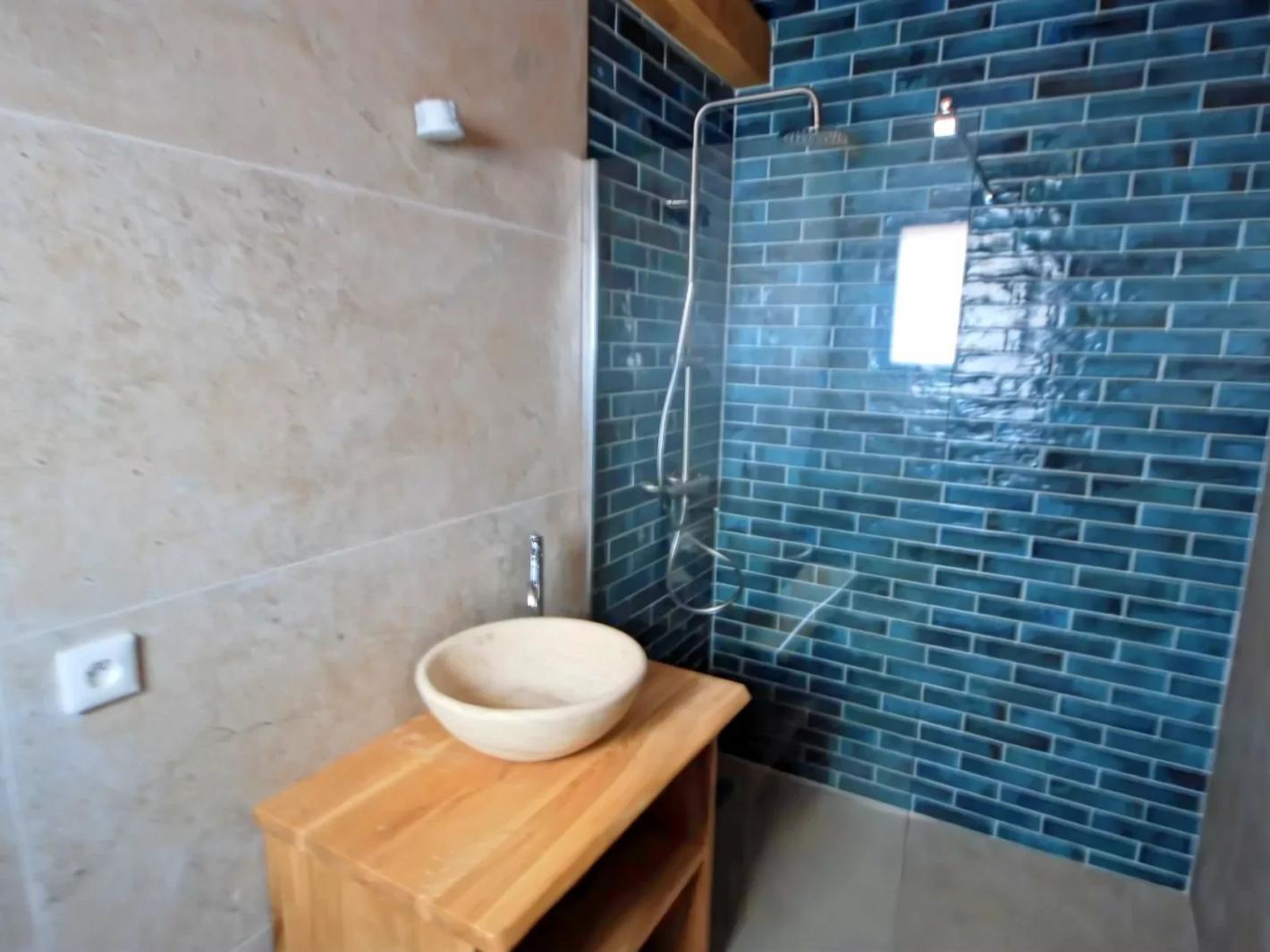 Le sol de la maison ainsi que les murs de la salle de bain sont en carrelage travertin. Le coin douche est recouvert d'une faïence toute hauteur.